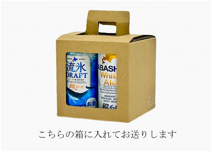 | 商品内容 | 流氷ドラフト(缶)(発泡酒/350ml/Alc5%)1本 ABASHIRI White Ale(発泡酒/350ml/Alc4.5%)1本 ABASHIRI Golden Ale(ビール/350ml/Alc5%)1本 ABASHIRI ARTISAN ALE(ビール/350ml/Alc6%)1本 |